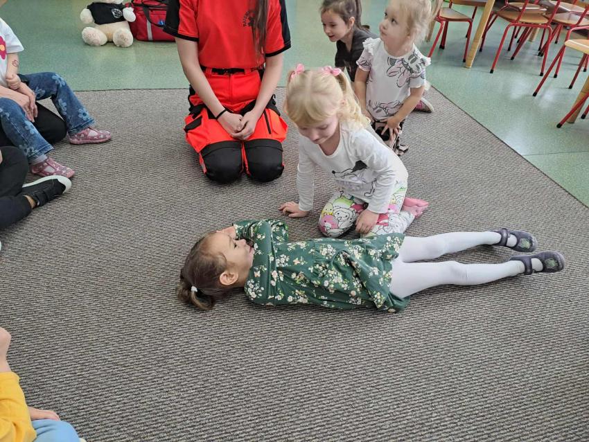 Pani Nikola pokazała nam, co znajduje się w torbie ratownika, jak prawidłowo założyć opatrunek oraz jak udzielić pomocy osobie, która straciła przytomność. Każde dziecko mogło spróbować swoich sił w bandażowaniu i ćwiczeniu pozycji bezpiecznej. Pani Nikola podkreśliła, że ratownicy medyczni pomagają każdemu- niezależnie od wieku, i że każdy z nas może uratować komuś życie, jeśli zna podstawowe zasady pierwszej pomocy. Dzieci również powtórzyły numer alarmowy 112.